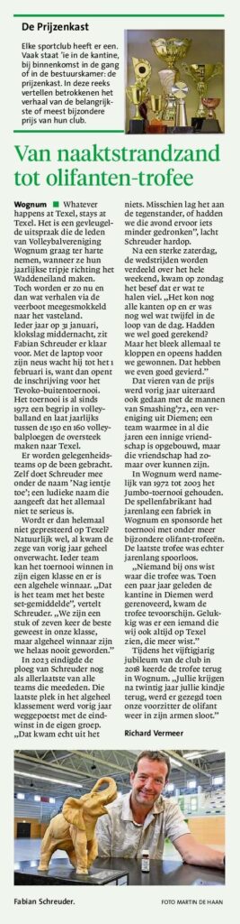 Dat vieren van de prijs werd vorig jaar uiteraard ook gedaan met de mannen van Smashing’72, een vereniging uit Diemen; een team waarmee in al die jaren een innige vriendschap is opgebouwd, maar die vriendschap had zomaar over kunnen zijn. In Wognum werd namelijk van 1972 tot 2003 het Jumbo-toernooi gehouden. De spellenfabrikant had jarenlang een fabriek in Wognum en sponsorde het toernooi met onder meer bijzondere olifant-trofeeën. De laatste trofee was echter jarenlang spoorloos. “Niemand bij ons wist waar die trofee was. Toen een paar jaar geleden de kantine in Diemen werd gerenoveerd, kwam de trofee tevoorschijn. Gelukkig was er een iemand die wij ook altijd op Texel zien, die meer wist.”